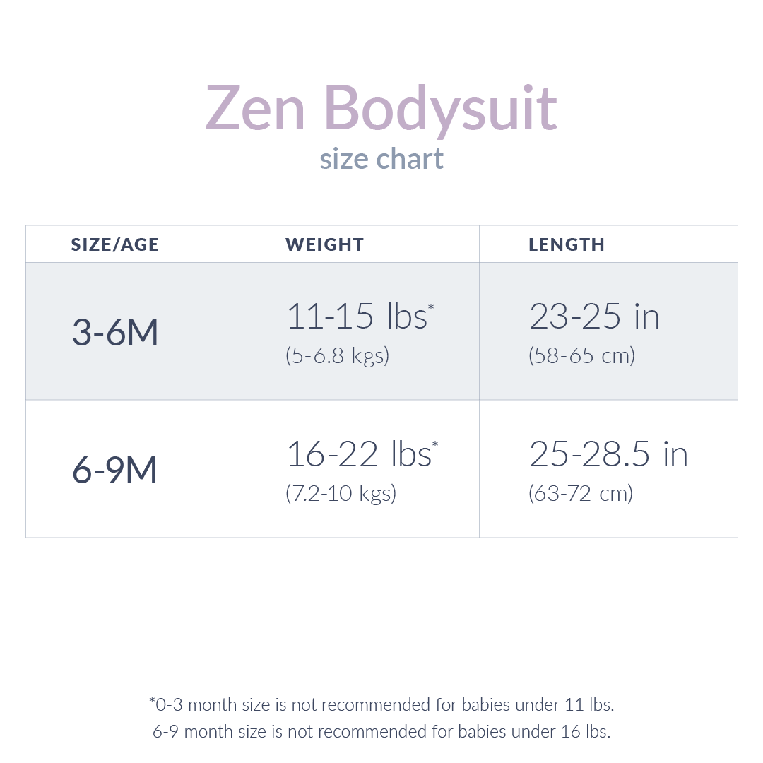 Our Zen Bodysuit comes in 3-6 months and 6-9 months sizes to fit your growing newborn comfortably. This newborn sleepwear collection by Nested Bean is designed to accommodate your baby's rapid growth while maintaining the perfect fit for optimal comfort.
